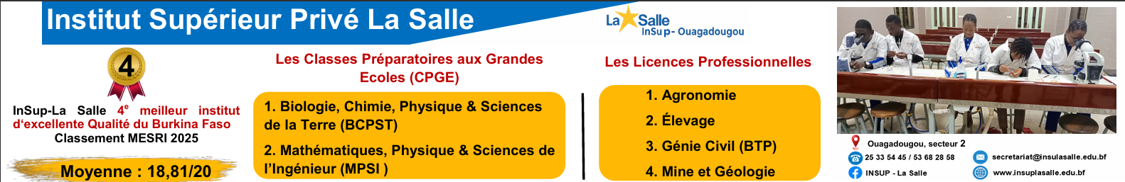 Les Frères des Écoles Chrétiennes ou « Frères de La Salle » dont le charisme est le service éducatif des pauvres, sont présents au Burkina Faso depuis 1948 à travers un réseau de dix sept établissements d’enseignement primaire, secondaire , de formation technique-professionelle et le supérieur .